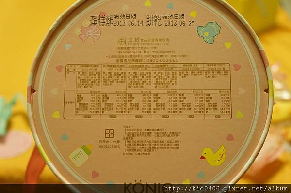 ↑禮盒的底端除了印有蛋糕類及餅乾類的有效日期,還印上內容物的項目、成份、重量及營養標示,也很貼心的寫上是否含有蛋、奶、素等。