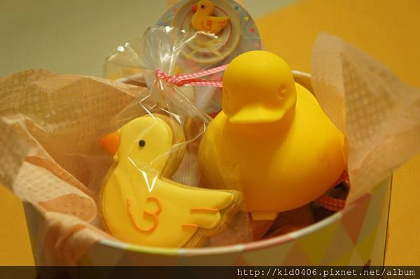 ↑來隻洗澡用黃色小鴨以及黃色小鴨造型餅乾的合照...XD (洗澡用黃色小鴨為自備物品,並不包含在禮盒中XD)